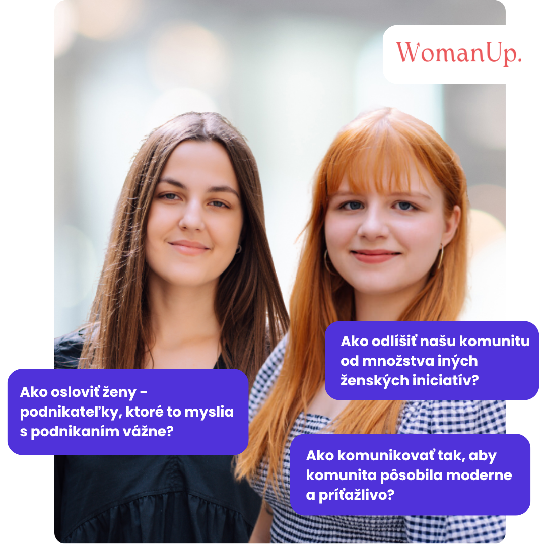Za WomanUp stojí dvojica talentovaných mladých podnikateliek. Vytvorili projekt, ktorého cieľom je inšpirovať, oslavovať a vyzdvihovať ženy. Tvorili eventy a programy pre podnikateľky, freelancerky a ženy v biznise.